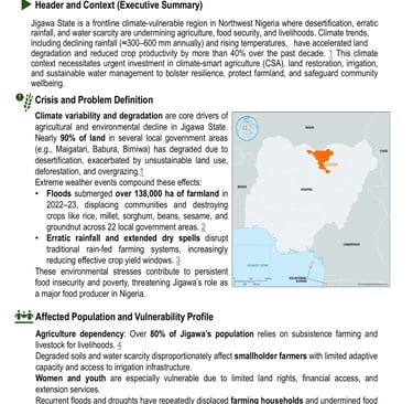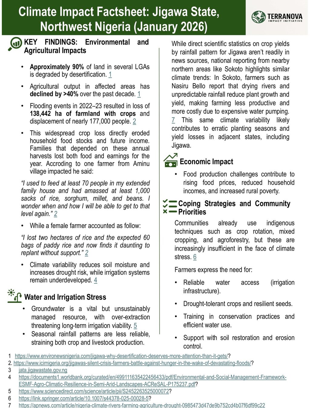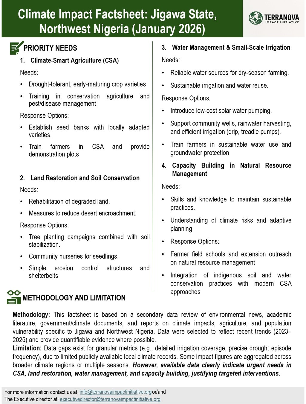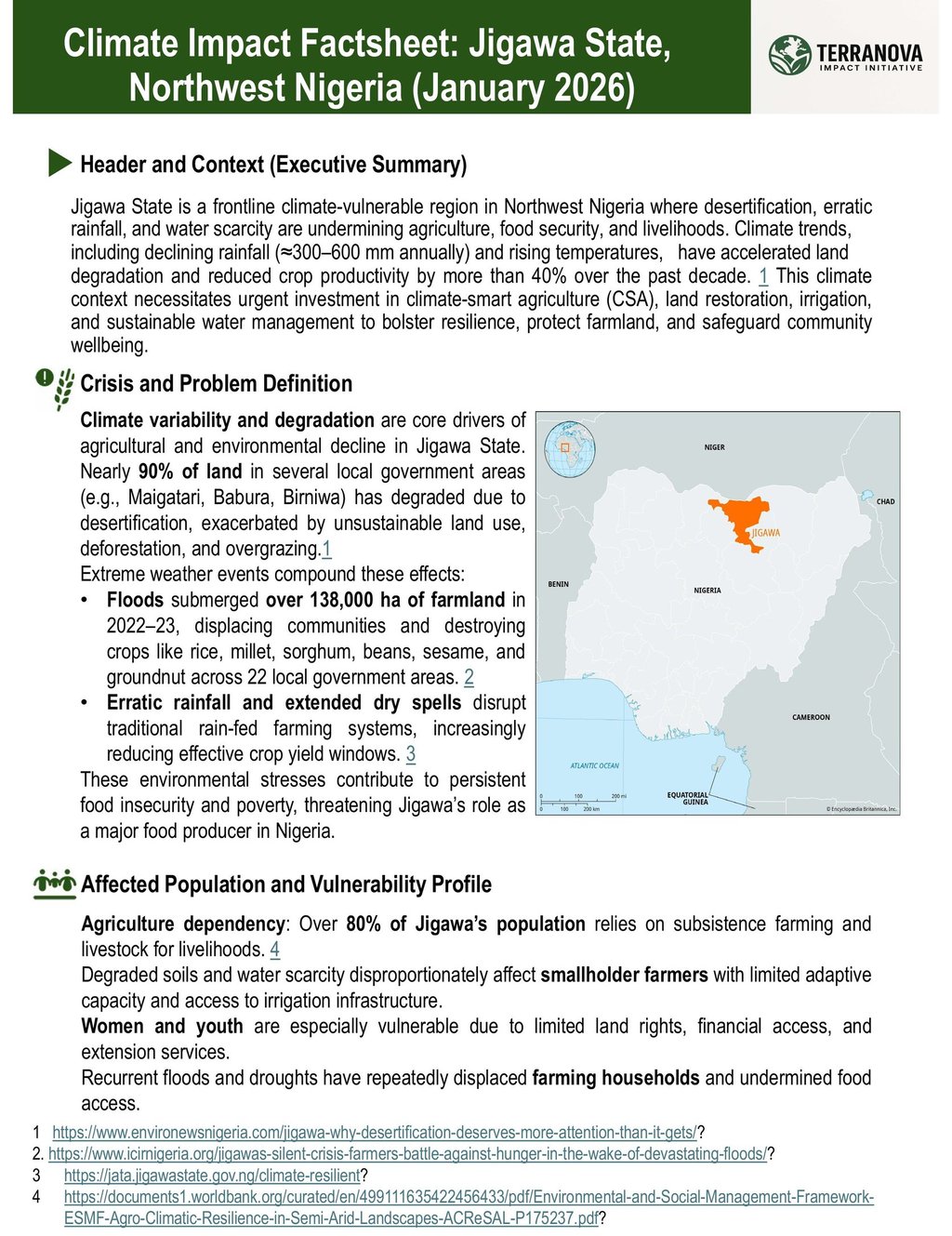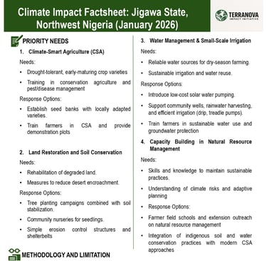 TERRANOVA produces evidence-based situational analyses to guide program design, investment decisions, and advocacy. This Climate Impact Factsheet highlights the scale and urgency of climate vulnerability in Jigawa State, Northwest Nigeria, and outlines priority intervention areas.